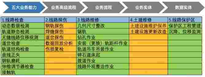 在轨道运维业务中,,,,,,,,,,,,我们形成了完整的从业务能力(业务域)-业务流程-业务实体-数据模型的分析梳理过程。。。。。。。。。轨道运维业务能力如下图所示:::::::