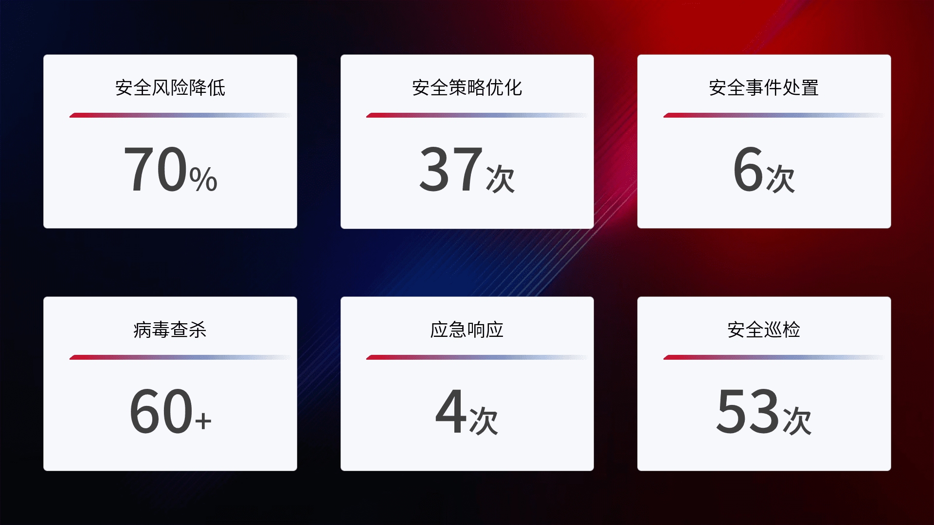 提供全面的安全事件报告体系,,,包括处置报告、、、周报、、、、季度和年度总结,,结合持续监控,,,,帮助客户深入了解网络安全状况。。。
